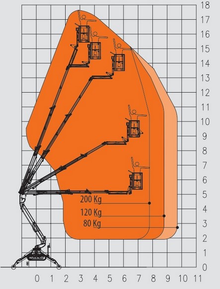 Mit einer Arbeitshöhe von 17,60 m einer maximalen Seitlichen Reichweite von 8,50 m sowie einer Korblast von 200 kg,
