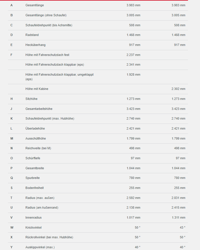 Technische Daten "Knickradlader Hoftrac 1160 "
