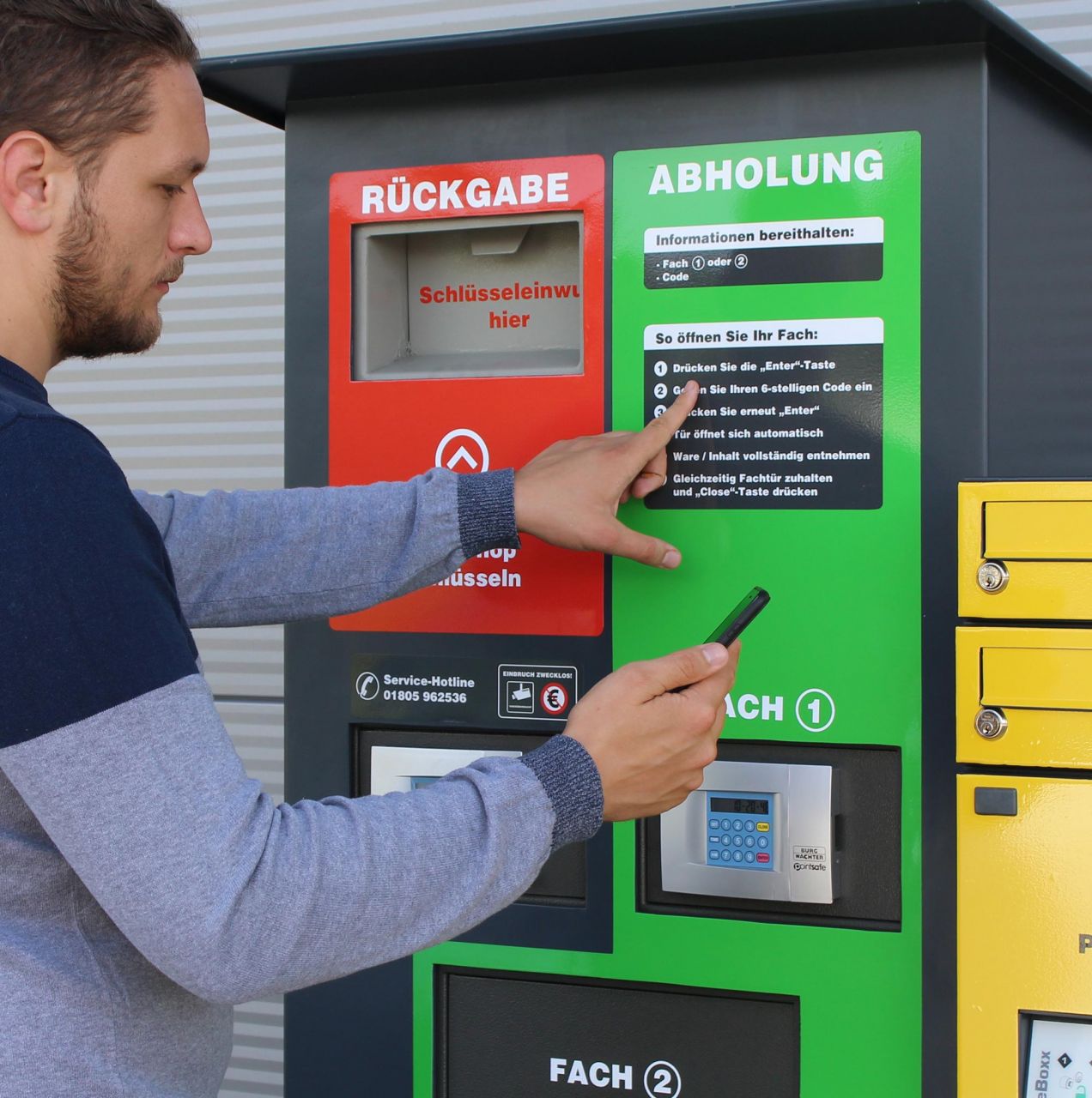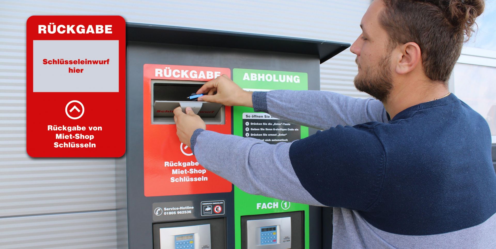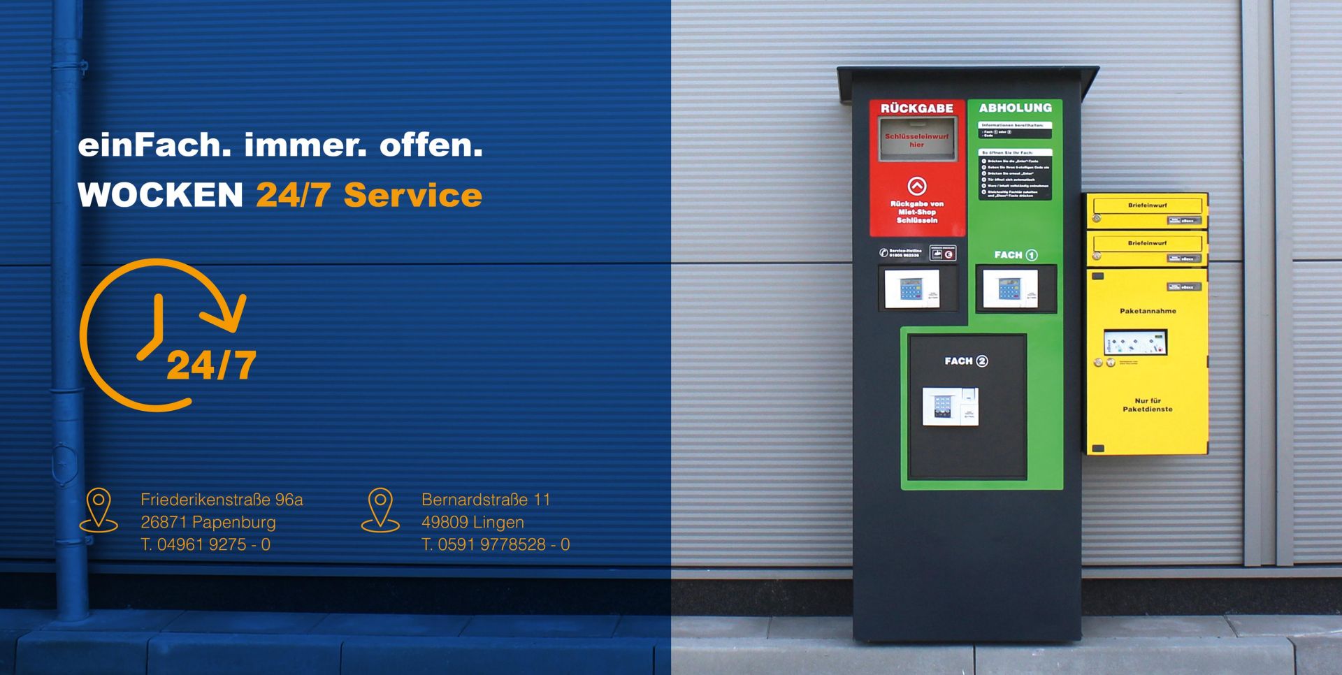 Nur Sie als WOCKEN-Kunde der Niederlassungen Lingen und Papenburg können ab sofort außerhalb der regulären Öffnungszeiten 24 Stunden pro Tag, Mietgeräte ganz in Ruhe zurückbringen oder Schlüssel für Mietgeräte abholen. Mit dem 24/7 Serviceautomaten von WOCKEN kann auch Ware in begrenzter Menge und Größe außerhalb der Öffnungszeiten abgeholt werden.