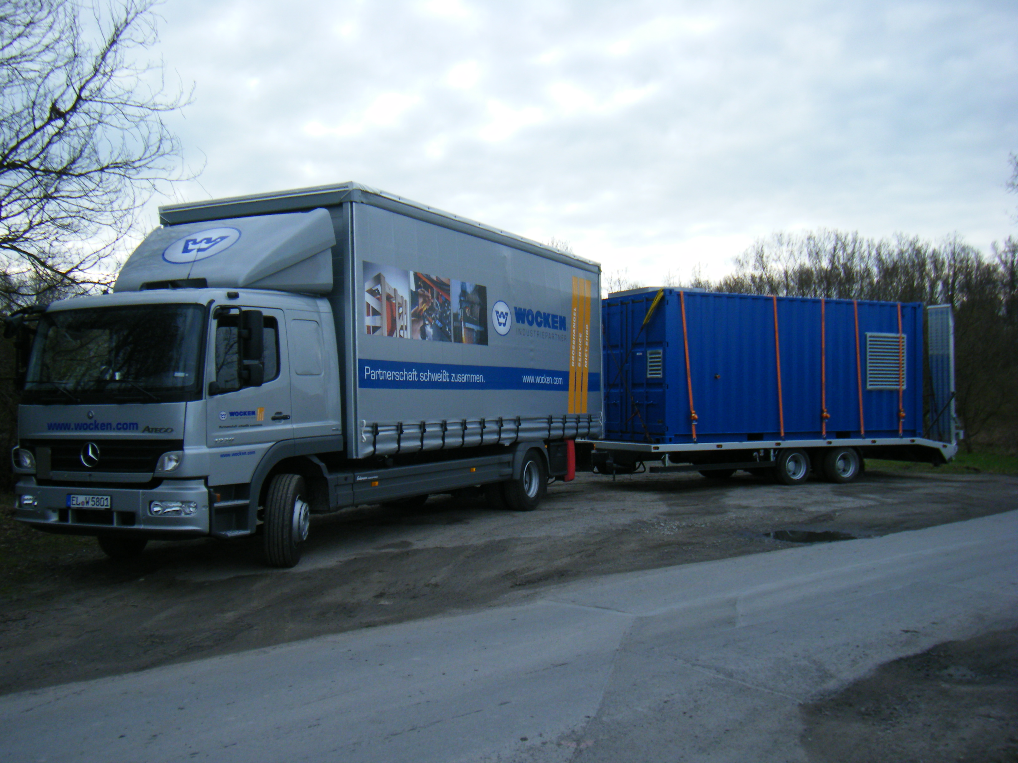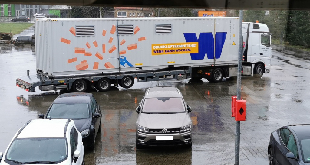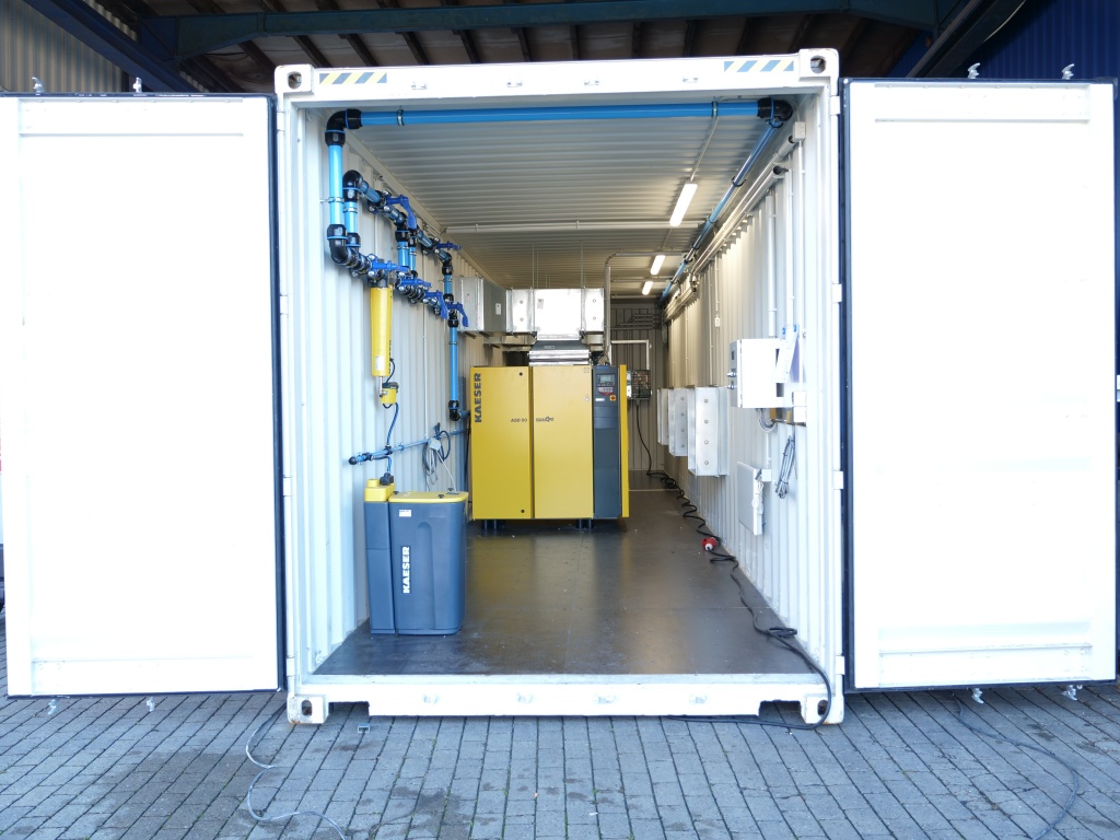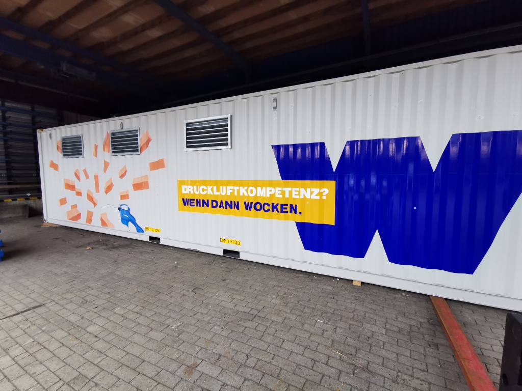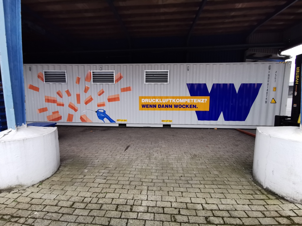 Die Mitglieder des Druckluftteams Wilfried Gerdes (Fachaußendienst), Ingo Topphoff (technisches Projektmanagement) und den beiden Monteuren Hans Holt und Daniel Janssen-Schnieders montierten eine maximale Liefermenge von 11.550 l/min bei 10 bar mit insgesamt 75 kW elektrischer Kompressor-Leistung. Zusätzlich wurden die Kompressoren mit einem Plattenwärmetauscher versehen. Damit können bis zu 65,10 KW Heizleistung ins Warmwassernetz der Kundenheizung eingespeist und so die "Abwärme" der Kompressoren als Wärmequelle nutzbar gemacht werden.Die Beratungsleistung von WOCKEN beinhaltet auch die Möglichkeiten der staatlichen BAFA*-Förderung. So konnte der Kunde seinen Investitionsaufwand spürbar reduzieren. Maike Kruse (Mediengestaltung) von WOCKEN entwarf ein individuelles Dekorationsmotiv und setzte die Beklebung des Containers kurzfristig um.