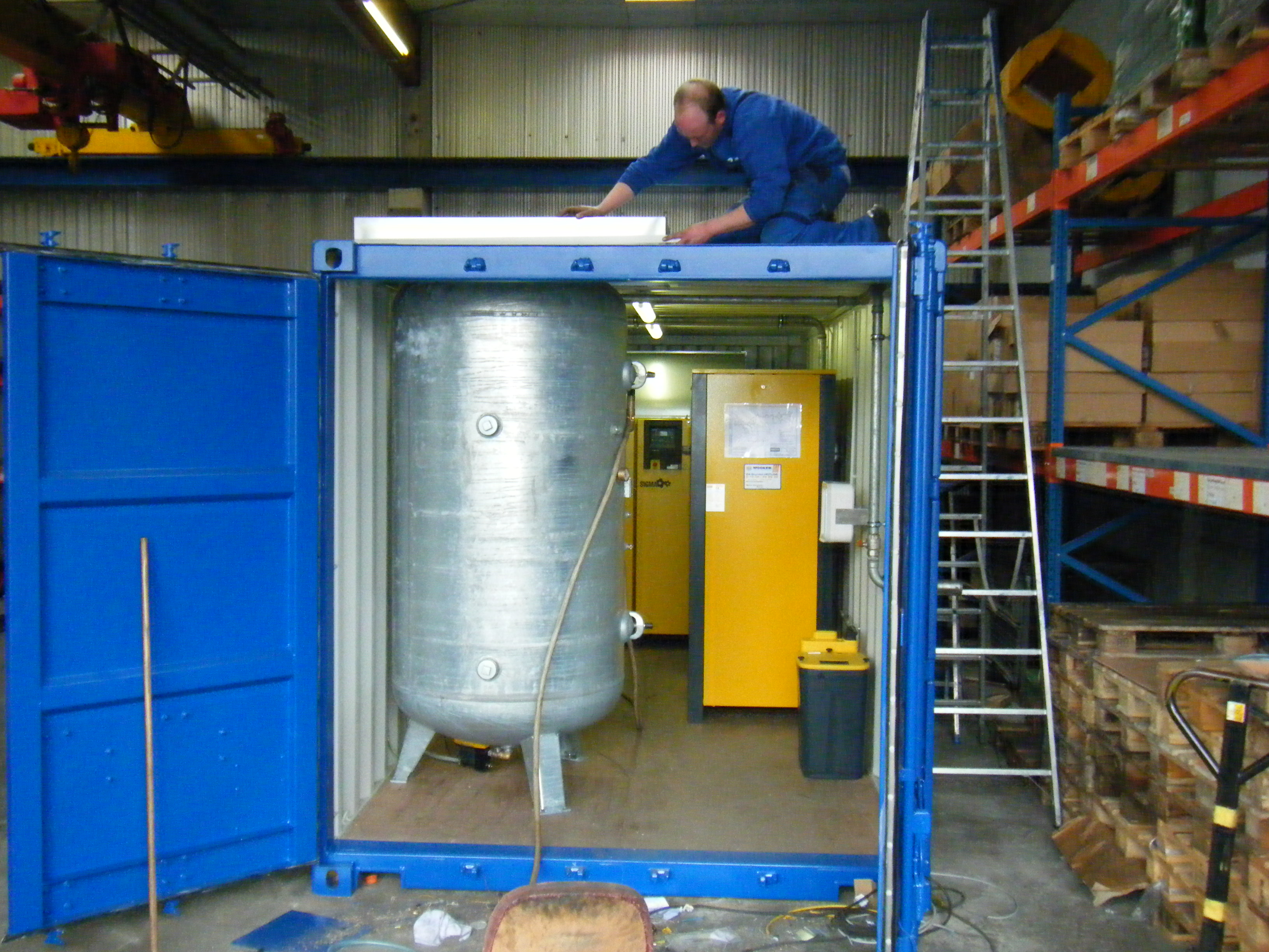 Eine besondere Herausforderung hatten Projektleiter Wilfried Gerdes, Teamleiter Drucklufttechnik, Hans Holt und Sascha van Held sowie Niederlassungsleiter Meppen Ingo Topphoff und Gero Boos, Verkauf Innendienst Emden, zu meistern. Innerhalb von nur drei Wochen wurde für unseren Kunden Trianel Gasspeicher Epe GmbH & Co. KG ein spezielle Kompressoranlage für ein Gasspeicherwerk in Gronau/Ochtrup konstruiert. Die Anlage dient dazu, einen riesigen Elektromotor mit Druckluft gasfrei zu sprühen. Die gesamte Kompressoranlage wurde in einem Container montiert, da sich das dafür vorgesehene Gebäude noch im Bau befindet. Nach der Fertigstellung des Gebäudes im August muss die Anlage dann aus dem Container abgebaut und im Gebäude wieder aufgebaut werden. Dieses Projekt zeigt, wie schnell und flexibel unsere Kolleginnen und Kollegen auf Kundenwünsche reagieren können.